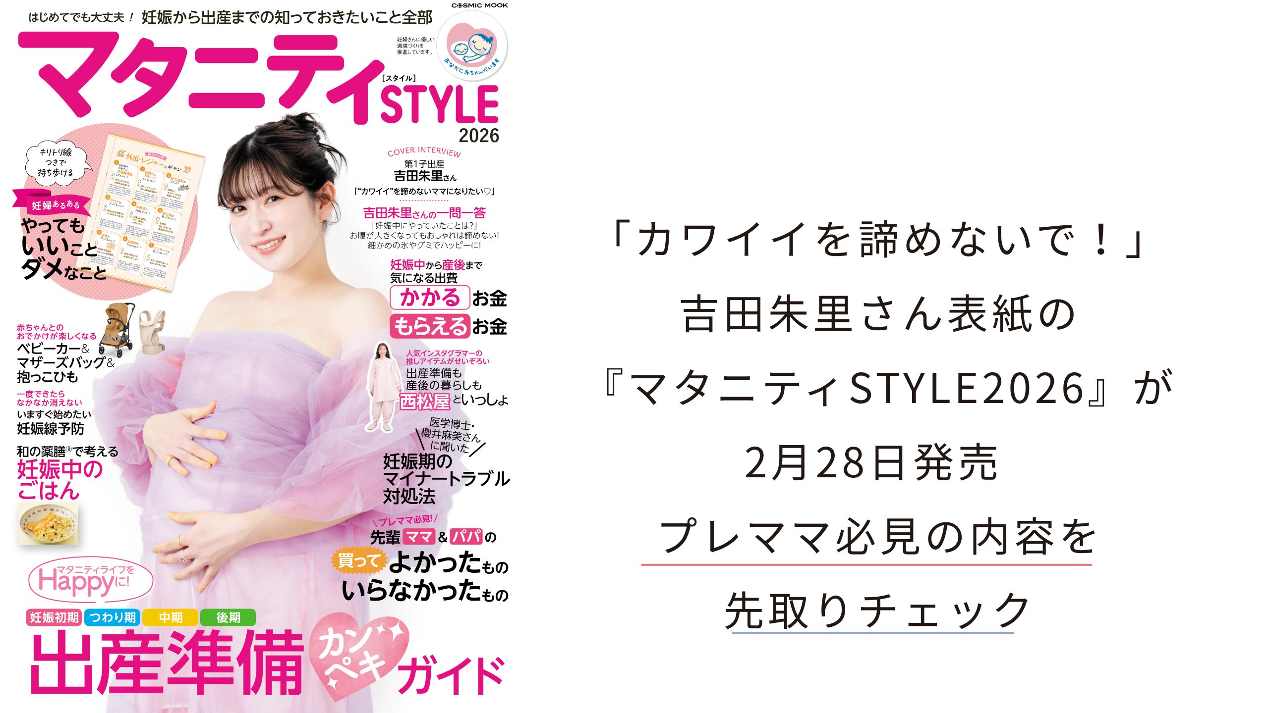 そんなプレママさんにぴったりの一冊が、2026年2月28日(土)に発売されます。その名も『マタニティSTYLE2026』。今号の表紙は、元NMB48・モデルの吉田朱里さん!不妊治療を経て第1子を妊娠中の吉田さんが、リアルなマタニティライフを全力でシェアしてくれています♡